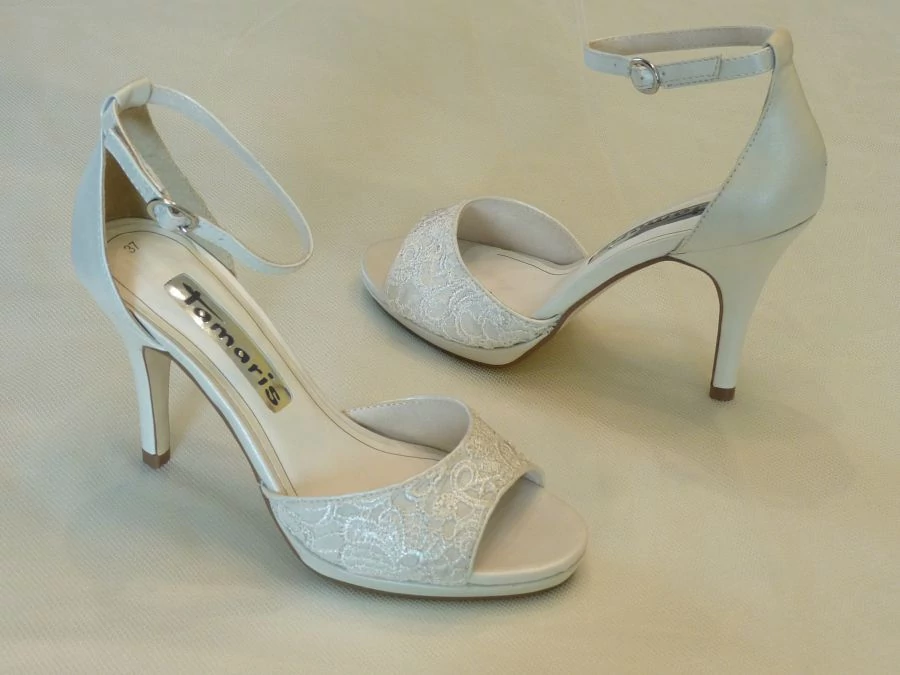 Csipke anyaggal díszített, ivory színű kérges szandál. Csatolópántja szabályozható. Talprésze légpárnával készült, így kényelmes járást nyújt egész napra. Nyári esküvőkre ajánljuk, normál lábra. Sarokmagasság: 9,5cm